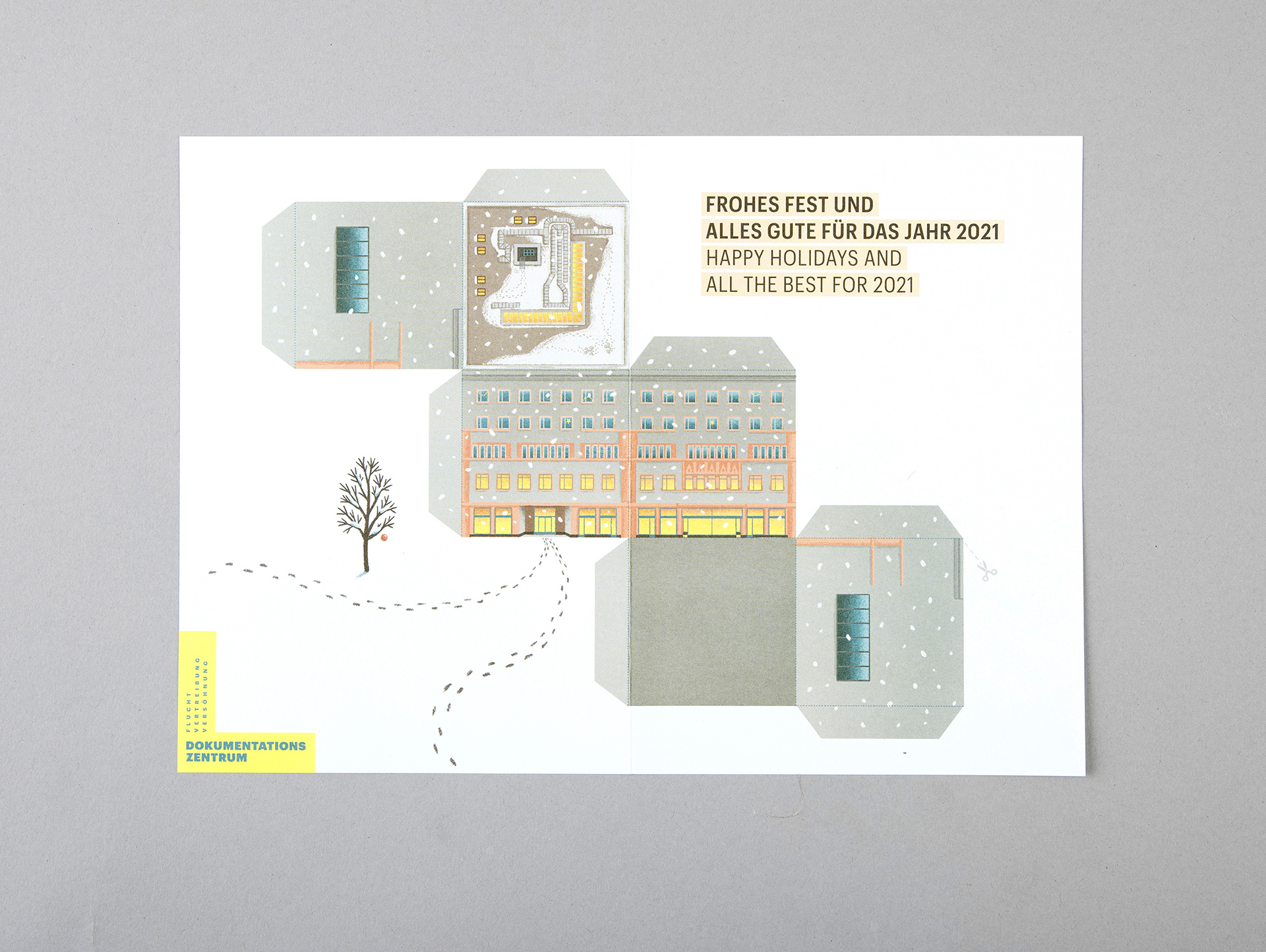 Illustration of a christmas card and a paper model sheet of the Documentation Centre for Displacement, Expulsion, Reconciliation in Berlin.
