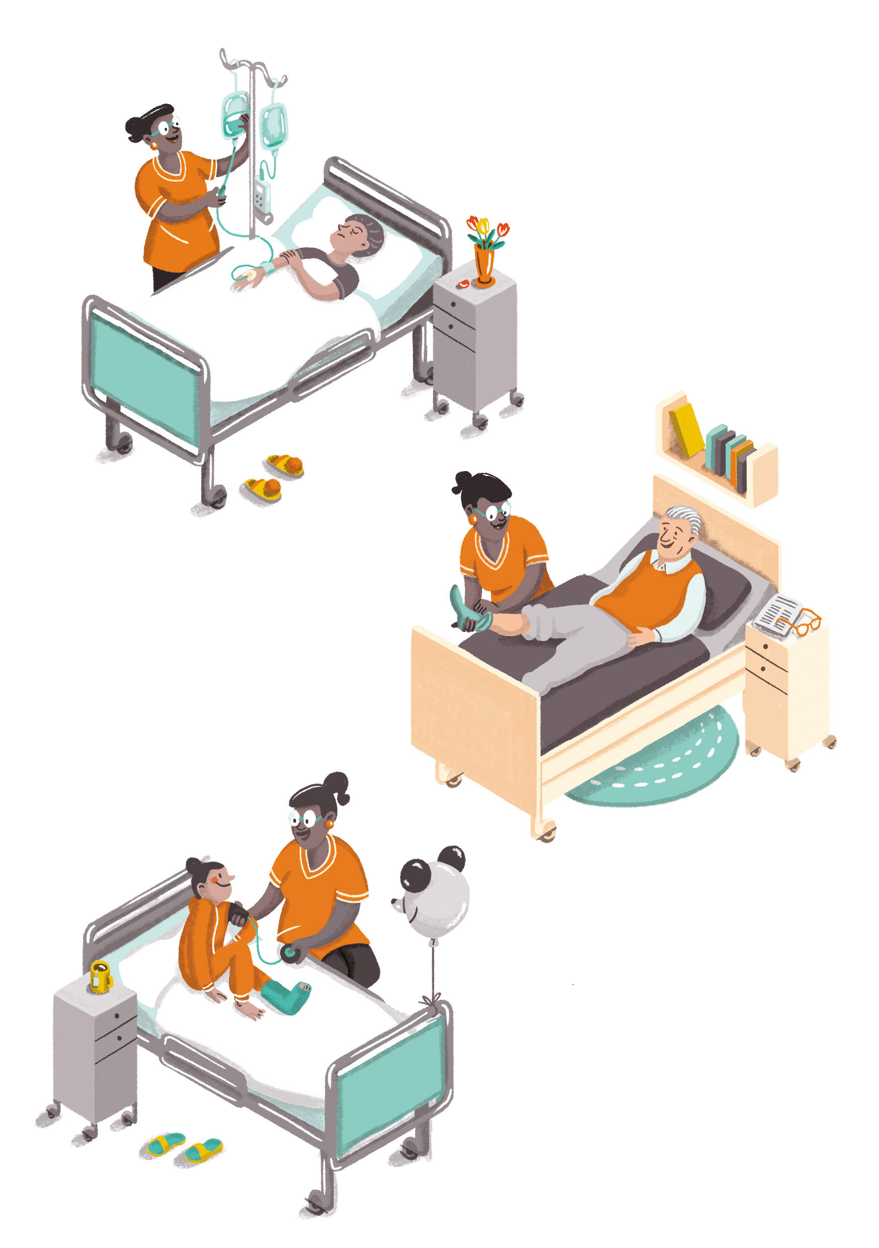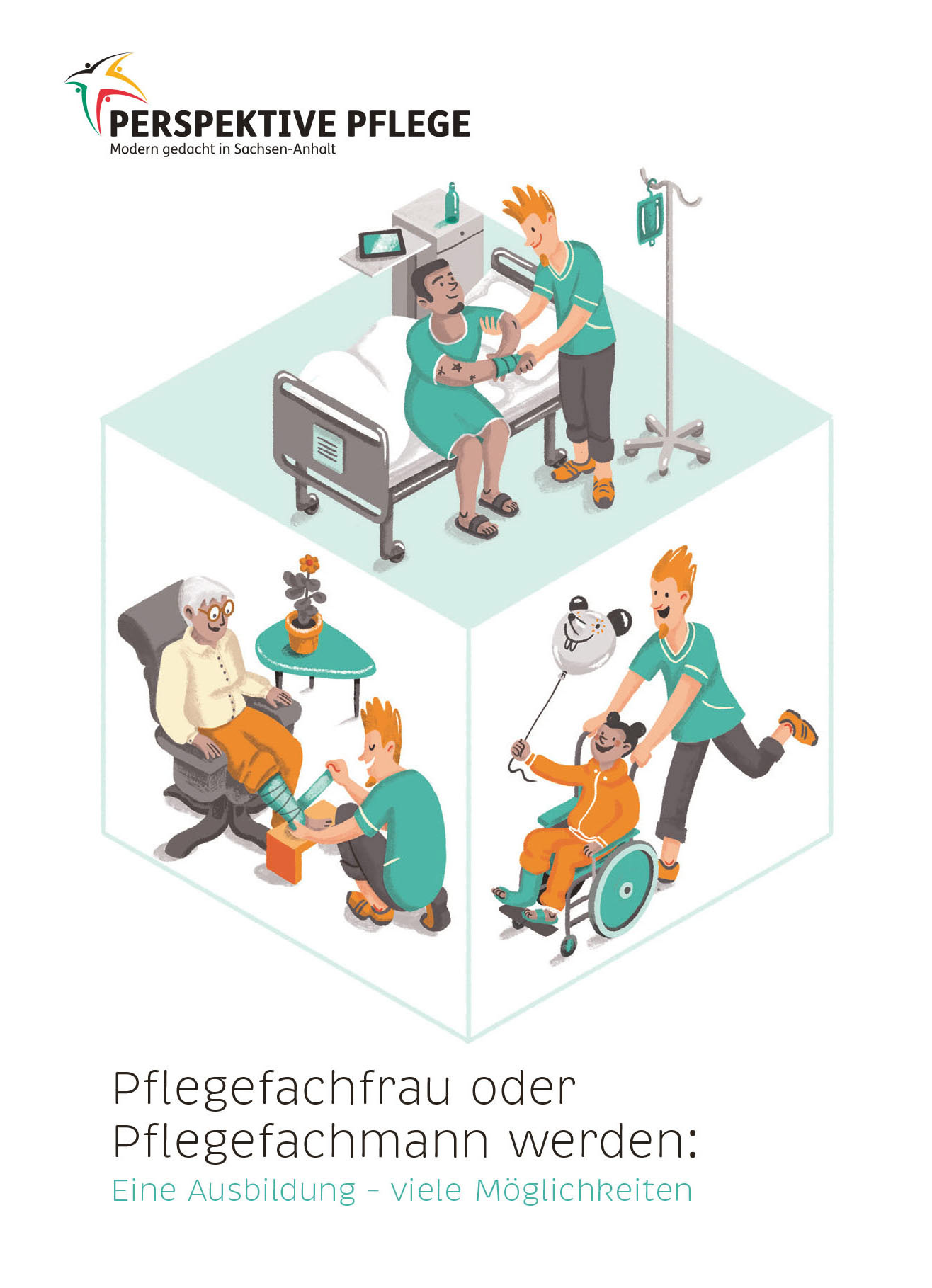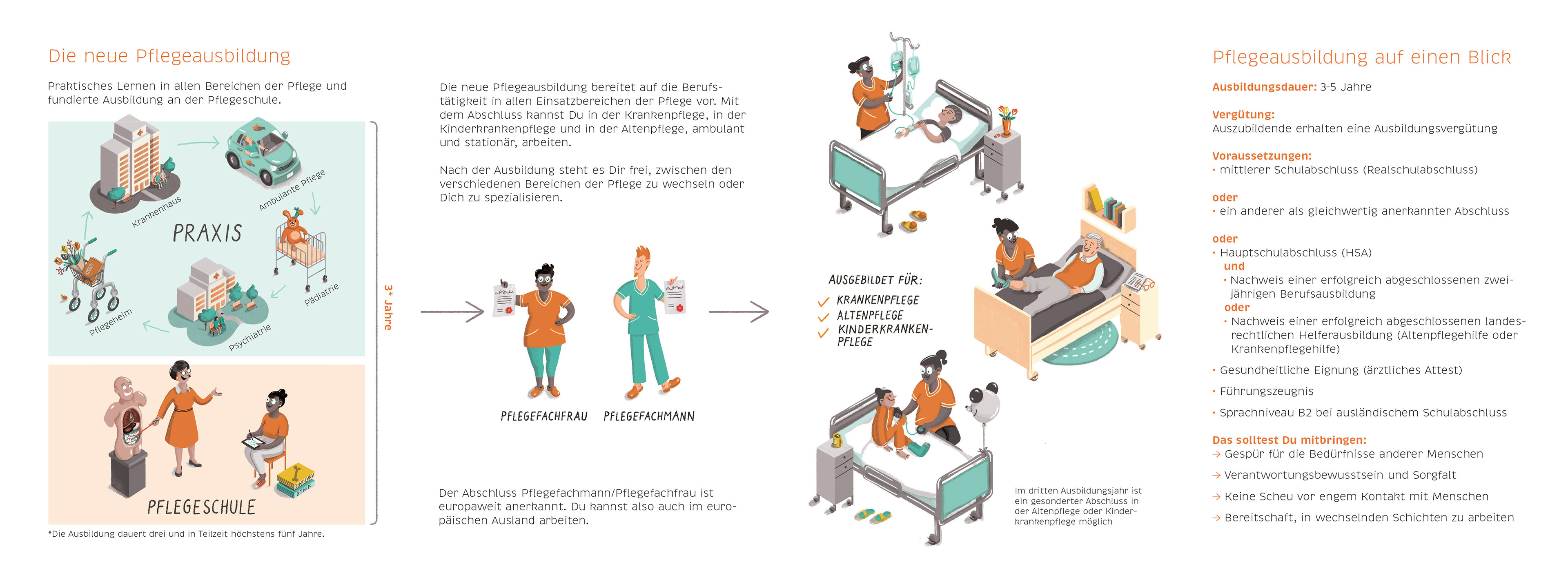 Illustrations for a flyer that gives an overview of job perspectives for people that have absolved a professional training as a care giver.